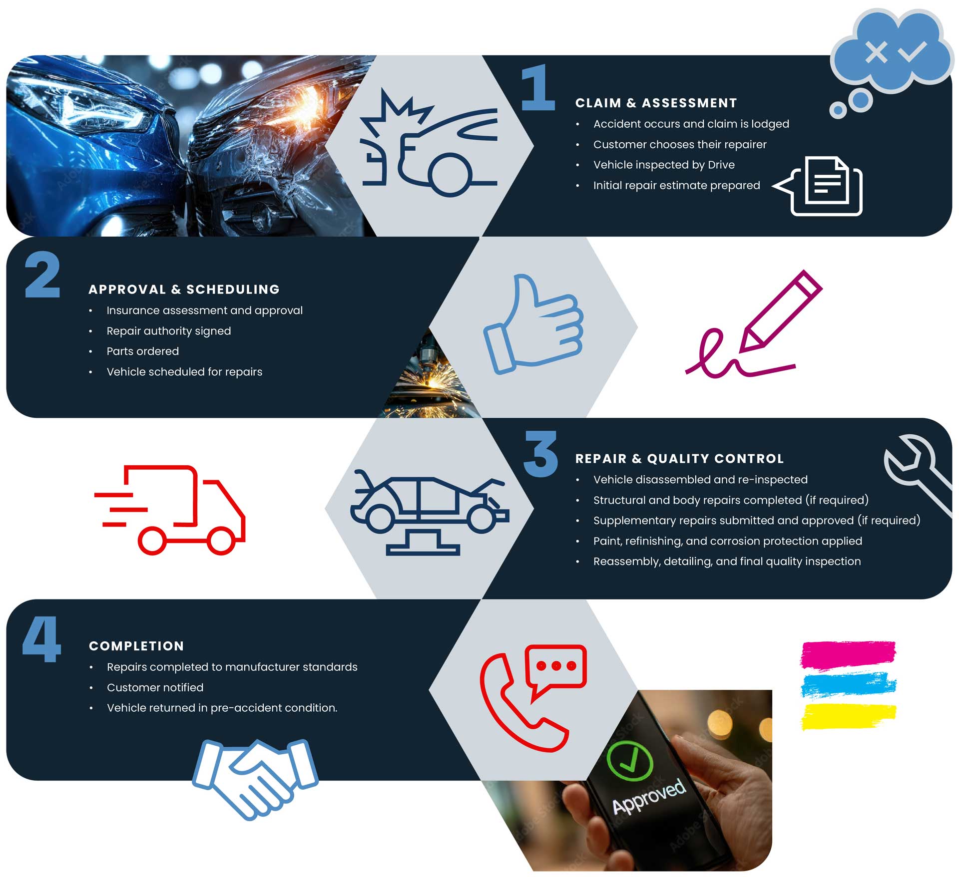 Insurance repairs involve multiple steps, approvals, and quality checks. Below is an overview of what happens behind the scenes to ensure your vehicle is repaired safely and correctly.